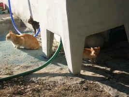 Não passara ainda o tempo de dizer um ai quando ouvi dois miados angustiados: eram o Bolinha e o Ratito que tinham ficado enclausurados dentro de casa. Para os leitores que ainda não provaram muita intimidade com os meus gatos, devo esclarecê-los que estes bichos só viram como tecto, em toda a sua curta vida, o céu azul e a barriga bojuda do tanque de lavar roupa adornado nas traseiras do "Anexo". Os pelos todos em pé, as gargantas estridentes, o susto estampado no rosto, os coraçõezitos a badalar desesperadamente nos peitos peludos, aqueles gatos metiam dó. Tentei pegar neles mas só piorei a situação. A tentar fugir-me, escorregavam de pernas abertas sobre a tijoleira ainda molhada parecendo aprendizes muito incipientes de patinagem no gelo com os patins a fugir para os lados opostos. Ao fim de algum tempo, depois de ter o discernimento de lhes abrir a porta da cozinha, fugiram parecendo que levavam o demónio atado nos rabos.