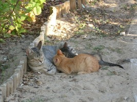 Não passara ainda o tempo de dizer um ai quando ouvi dois miados angustiados: eram o Bolinha e o Ratito que tinham ficado enclausurados dentro de casa. Para os leitores que ainda não provaram muita intimidade com os meus gatos, devo esclarecê-los que estes bichos só viram como tecto, em toda a sua curta vida, o céu azul e a barriga bojuda do tanque de lavar roupa adornado nas traseiras do "Anexo". Os pelos todos em pé, as gargantas estridentes, o susto estampado no rosto, os coraçõezitos a badalar desesperadamente nos peitos peludos, aqueles gatos metiam dó. Tentei pegar neles mas só piorei a situação. A tentar fugir-me, escorregavam de pernas abertas sobre a tijoleira ainda molhada parecendo aprendizes muito incipientes de patinagem no gelo com os patins a fugir para os lados opostos. Ao fim de algum tempo, depois de ter o discernimento de lhes abrir a porta da cozinha, fugiram parecendo que levavam o demónio atado nos rabos.