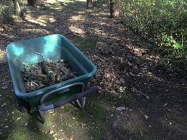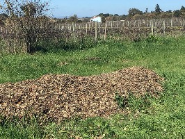 O resto do tempo passei-o na mata a recolher folhas e ramos secos caídos das árvores e a levá-los para o local onde se irá fazer o próximo composto. É varrer com a vassoura de jardim, arrastar os montículos com o ancinho, apanhar para o carro com a forquilha, atestar e compactar e, ala, lá vamos nós, eu, o carrinho e os gatos que nos acompanham para todo o lado, percorremos os caminhos da mata, passamos no Eixo Norte-Sul à sombra dos marmeleiros, a pisar os marmelos negros e engelhados que se acumulam no solo, até entrarmos no campo ensolarado a norte do pomar onde vou dispor os materiais nos montículos de ramos de poda e de erva ceifada que lá se acumula.
