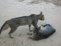 Brincava muito com eles. Ainda brinca com o Fofinho e a Farrusca. Estes são grandes, anafados, confiantes e espertos a contrastar com os primos que têm metade do seu tamanho, são tímidos e pouco devem à esperteza.
